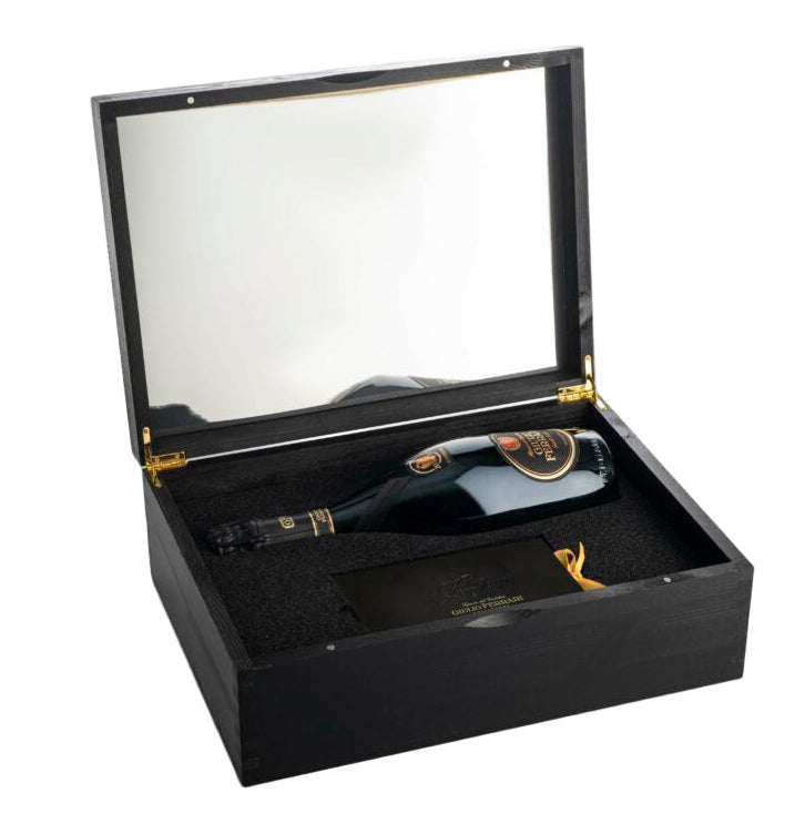 Descrizione: Colore giallo dorato luminoso, sostenuto da un perlage finissimo e persistente. Al naso conquista per complessità aromatica ed eleganza: note di noci pecan e macadamia si intrecciano a quelle di nocciole tostate, caramello, caffè torrefatto e crème brûlée. Al palato sorprende per la freschezza agrumata prima di chiudere su un finale sapido e minerale, di straordinaria persistenza e impreziosito da delicate sfumature iodate. Prodotto in pochissimi esemplari numerati custoditi in eleganti cassette di legno per una bottiglia status symbol che ancora una volta vince la sfida del tempo.